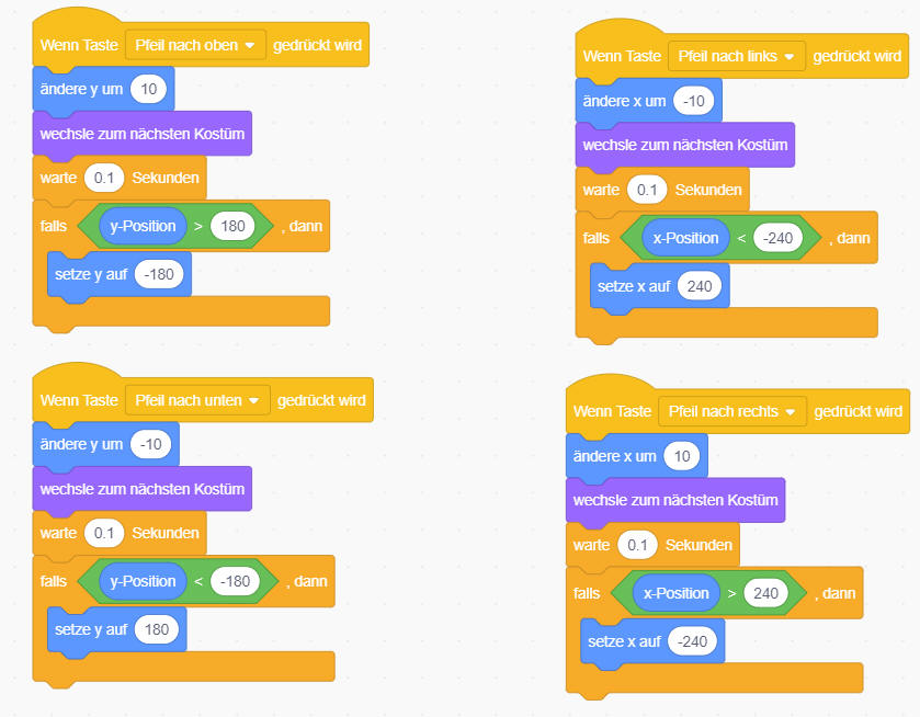 - Wenn die obere Pfeiltaste gedrückt wird, bewege die Katze x-Einheiten nach oben. Falls die y-Position größer als 180 ist, dann setze die y-Position auf -180