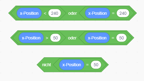 Der zu überprüfende Wert kann größer, kleiner oder gleich als ein vorgegebener Wert sein. In der Mathematik gibt es aber auch den Vergleich <= (kleiner gleich) oder >= (größer gleich) oder <> (ungleich). Wie kann man dies in Scratch formulieren? In der Palette der Operatoren gibt es noch die folgenden Befehle: